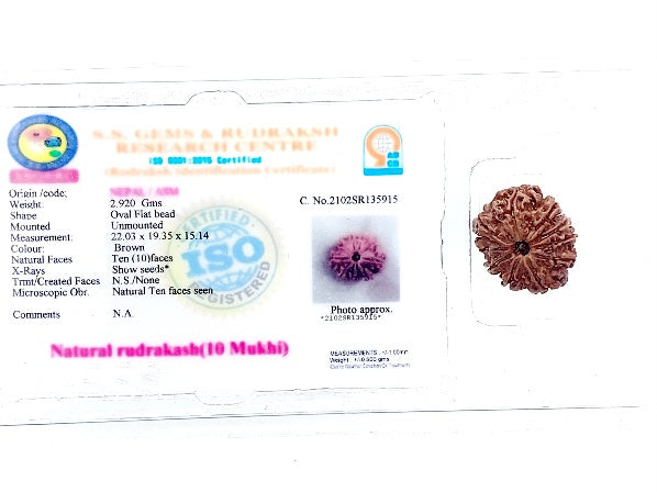 10 मुखी रुद्राक्ष को भगवान विष्णु के दस अवतारों का प्रतीक माना जाता है। यह रुद्राक्ष शिवपुराण में भगवान विष्णु के अंश के रूप में वर्णित है, जिससे इसे धारण करने वाले व्यक्ति पर भगवान विष्णु, माता लक्ष्मी और देवी गंगा का आशीर्वाद हमेशा बना रहता है।