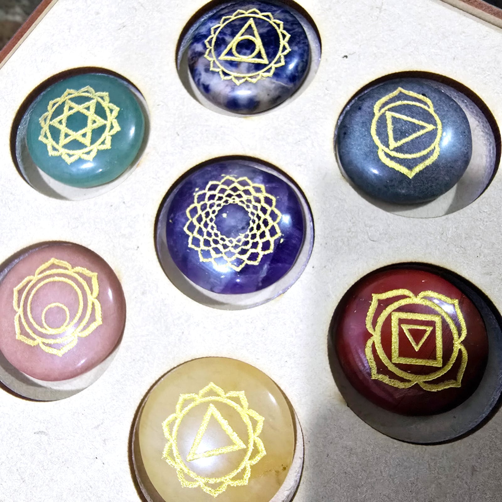 7 चक्र गोल टम्बल सेट लकड़ी के बक्से में