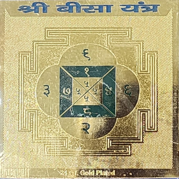 यंत्र शास्त्र में बीसा यंत्र को बहुत महत्वपूर्ण माना जाता है। बीसा यंत्र कई प्रकार के हो सकते हैं. इन यंत्रों में मौजूद शक्ति व्यक्ति की सभी इच्छाओं को पूरा करने में सक्षम है। यंत्र के माध्यम से व्यक्ति बहुत कुछ हासिल कर सकता है। बीसा यंत्र सभी इच्छाओं को पूरा करता है और व्यक्ति को भय, झगड़े और तर्क से मुक्त करता है। इस यंत्र का प्रयोग कई प्रकार से किया जा सकता है। इसे किसी मंदिर में स्थापित करें या पर्स में रखें। इस यंत्र का प्रयोग तांत्रिक क्रियाओं में भी किया जाता है। भागवत के अनुसार यंत्र व्यक्ति के भगवान का दूसरा रूप है। नारद पुराण के अनुसार बीसा मंत्र को भगवान विष्णु के समान ही महत्वपूर्ण माना गया है। बीसा यंत्र पर रत्न का अशुभ प्रभाव नहीं पड़ता है। कुंडली में शुभ फल लाने के लिए बीसा यंत्र का प्रयोग किया जाता है।