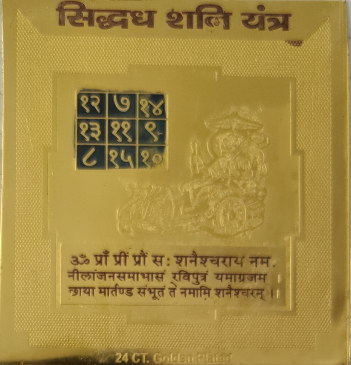 - बीज मंत्र (Beeja Mantra): यंत्र पर शनि का बीज मंत्र ("ॐ प्रां प्रीं प्रौं सः शनैश्चराय नमः") संस्कृत में लिखा होता है, जो शनि देव की ऊर्जा को आकर्षित और सक्रिय करने में सहायक होता है।